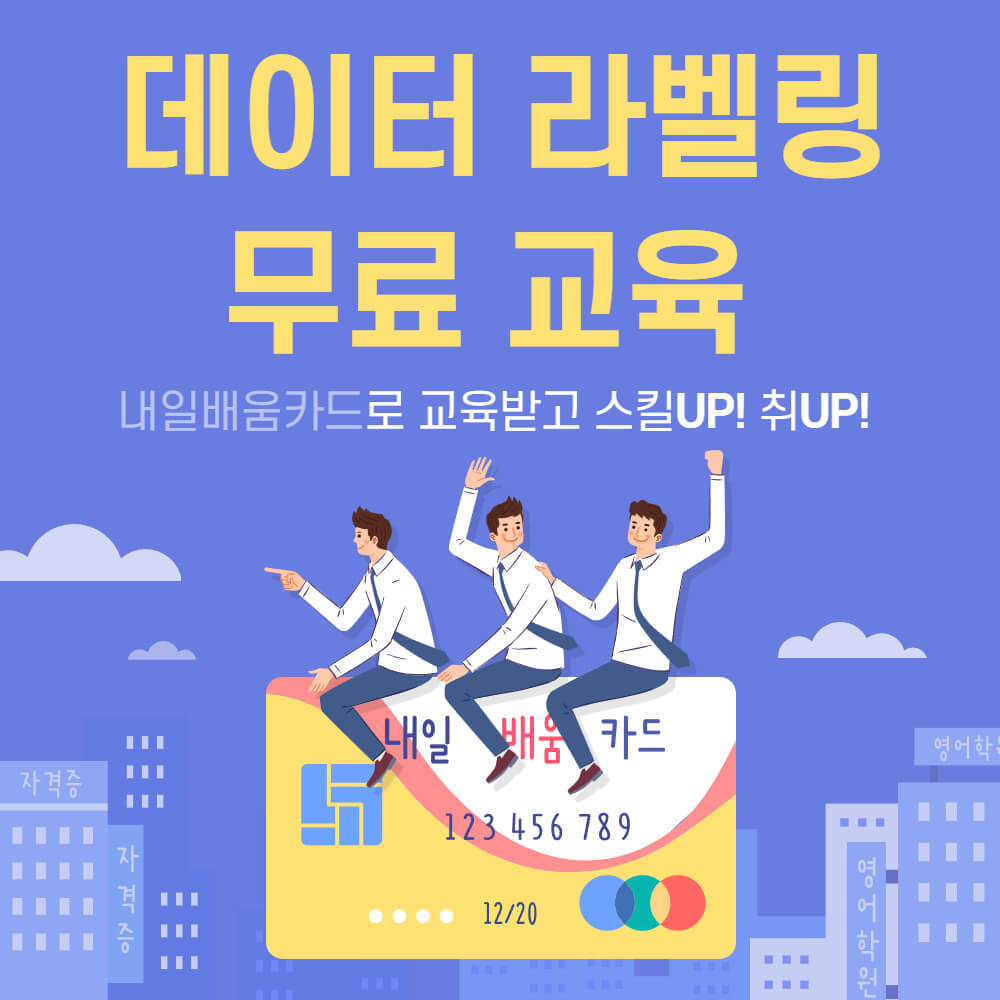 대표적인 데이터라벨링 교육센터인 `크라우드웍스`에서 내일 배움 카드를 통해 국비지원으로 무료 교육을 받을 수 있습니다. 온라인 교육이라 장소제한 없이 간편하게 수강할 수 있습니다.
