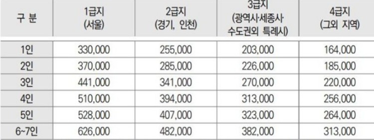 - 임차가구기준 : 2023년 기준 주거급여 금액과 가족수 그리고 지역별로 차이가 있습니다. 서울인 경우 1인가구인 경우 월 33만 원을 지원받을 수 있으며 지역에 따라 1 급지(서울),2 급지(경기, 인천),3 급지(광역시, 세종시, 수도권의 특례시),4 급지(그 외 지역)등으로 금액차이가 있으니 신청자의 지역을 잘 확인하시기 바랍니다
