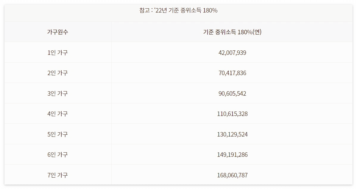 | 가구소득 | 가구원 수에 따른 기준 중위소득 180% 이하인 사람 직전 과세기간의 소득이 확정되지 않은 기간에 소득을 확인했을 때 전전년도 소득으로 인정이 됩니다. |