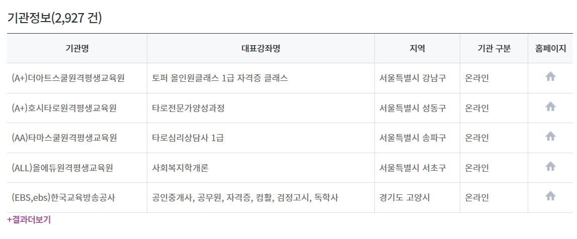 검색어를 입력하면 본인이 배우고 싶은 온라인,오프라인 교육기관을 확인하실 수 있습니다.대표적으로 오프라인 교육기관에서는 대표적으로 운전학원을 등록해서 운전을 배울 수 있으며 온라인경우에는 타로심리상담사나 공인중개사나 각종 자격증의 강좌를 수강할 수 있습니다.